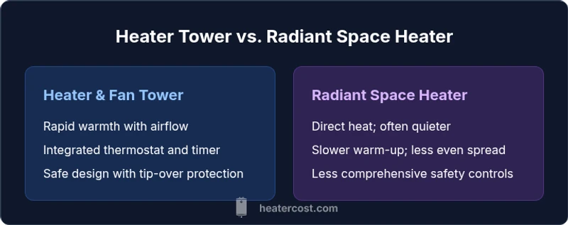Compare heater and fan combo towers, analyze heat output, safety, energy use, and costs. Heater Cost's analytical buying guide helps homeowners choose the best tower heater for small spaces.