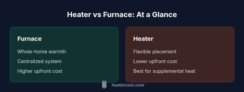 According to Heater Cost, the term heater typically refers to portable or localized devices that generate heat for a specific space, while a furnace is a central heating unit that disperses warm air through ducts or radiant systems to heat an entire home. The distinction matters for planning, energy use, and long-term comfort. A furnace is designed to provide uniform warmth across rooms, floors, and zones; a room heater targets one area and can be moved as needed. Understanding this difference helps homeowners set realistic expectations about comfort, energy efficiency, and maintenance needs. For many households, the choice comes down to climate, the size of the living space, and how evenly you want heat distributed. In chilly regions, a furnace often delivers dependable warmth, while in milder climates or smaller dwellings, a strategic mix of heaters can be cost-effective and flexible.