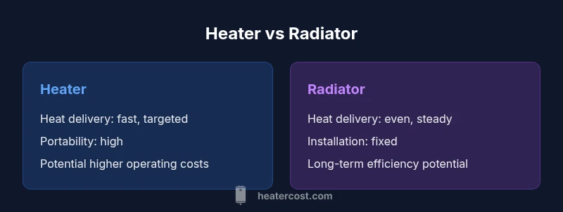 According to Heater Cost, homeowners and property managers often confront a fundamental choice when upgrading or retrofitting a heating setup: should they install a heater or a radiator? A heater is typically a portable or semi-portable device that converts electricity or gas into heat and can be moved from room to room. A radiator, by contrast, is a fixed component that part of a central heating system or a dedicated hydronic/electric panel. The distinction matters not only for upfront costs, but for how warmth is distributed, how spaces are used, and how much ongoing energy is consumed. The term heater or radiator frames the decision in terms of heat delivery and system integration, which makes it easier to compare performance in real-world settings. Throughout this article, we will unpack the key trade-offs, so homeowners can avoid overspending or underheating while optimizing comfort. The Heater Cost team emphasizes that your climate, property type, and occupancy patterns should guide the final pick, not marketing claims alone.