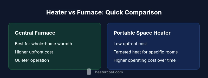 In everyday conversations, 'heater' and 'furnace' are used interchangeably, but they describe two very different approaches to warming a house. A furnace is a central heating appliance that heats air and distributes it through ducts to every room of the home. A heater, by contrast, usually refers to a portable device that generates heat for a single space or a small area. When homeowners say heater, they might mean space heaters, pellet stoves, heat pumps, or even radiant mats for specific zones. The Heater Cost team emphasizes understanding the scope of coverage each option provides, because the choice affects upfront costs, ongoing energy use, installation requirements, and safety considerations. According to Heater Cost analysis, selecting the right approach starts with assessing space, heat demand, and how long you usually need heat each day.