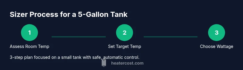 If you’re asking what size heater for a 5 gallon tank, the answer depends on several factors beyond just the tank’s volume. Ambient room temperature, desired water temperature, tank stocking (fish, plants, invertebrates), and the presence of heat sources all influence the required wattage. According to Heater Cost, reliable sizing begins with a conservative wattage and a thermostat that holds a stable set point. In most homes, a 5‑gallon aquarium benefits from a compact, adjustable heater that can be fine-tuned to maintain your target temperature without overheating. A well-chosen heater reduces temperature swings and stress on aquatic life, which translates to better health and color for your fish and plants. As you plan, record your room temperature and desired water temperature, then compare those values against the heater’s thermostat range to ensure a comfortable margin for seasonal changes.