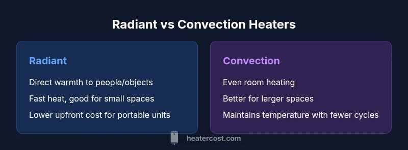 Radiant and convection heaters represent two distinct approaches to delivering warmth. Radiant heaters emit infrared energy that heats people and objects directly, creating comfortable warmth on contact without relying on ambient air temperature. Convection heaters, by contrast, warm the air in the room, which then circulates and heats objects gradually. When considering which is better radiant or convection heater, the fundamental trade-off is between fast, localized comfort and even, background warmth across a space. According to Heater Cost, this distinction becomes even more important in poorly insulated rooms or spaces with high heat loss. Portable radiant panels and electric infrared heaters provide bursts of warmth the moment you turn them on, while convection units, including oil-filled radiators and fan heaters, tend to sustain temperature more consistently over time. A key difference is heat distribution: radiant heat tends to stay near the source, whereas convection heat can fill corners and occupied zones. In evaluating a purchase, homeowners should measure the room’s size, insulation quality, floor plan, and how often a space will be used. The Heater Cost team notes that the optimal choice is often determined by the intended use, the available space, and seasonal energy costs.