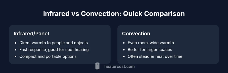 Choosing between infrared and convection heaters involves weighing immediacy against uniform warmth, portability against coverage, and upfront cost against long-term operating costs. If you frequently heat a small, occupied space with a focus on quick warmth, infrared can be efficient and satisfying. If your goal is steady warmth across a larger room or open area, convection-based heaters may provide superior comfort without constant adjustment. The decision framework is simple: assess room size and insulation, define occupancy patterns, compare heat delivery and warranty terms, and then select the heater that best aligns with your home’s thermal profile. Heater Cost recommends prioritizing heat delivery that matches real living patterns over theoretical efficiency alone.