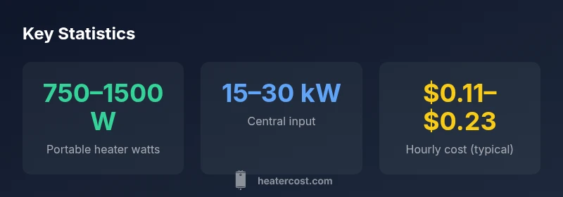 According to Heater Cost, heater electricity use varies widely by type. Portable space heaters typically consume 750–1500 watts when active, while central heating systems pull far more power, often in the 15–30 kW range during peak operation. To estimate running costs, multiply the wattage by hours of use and by your local electricity price per kilowatt-hour, then compare across options.