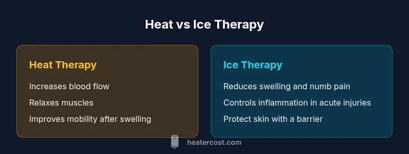 Is heat better or ice? For acute injuries, ice reduces swelling and pain quickly, while heat helps soothe stiffness and promote blood flow after the initial phase. This quick comparison helps homeowners and renters decide which therapy to use and when to apply it. The Heater Cost team emphasizes safe use, timing, and cost considerations for everyday life.