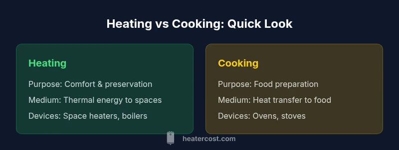The question often echoed in households asks, is heating the same as cooking? The concise answer is no, but the difference rests on intent, context, and safety. Heating describes methods used to raise ambient temperature for comfort, storage, or climate control, whereas cooking employs heat as a tool to transform raw ingredients into edible food. The two share fundamental physics—heat transfer occurs through conduction, convection, and radiation—but their endpoints diverge: maintaining a comfortable indoor climate versus achieving culinary readiness. Recognizing this distinction helps homeowners avoid misusing devices like space heaters for food preparation, which can create serious hazards. According to Heater Cost, a clear separation of terms supports smarter energy budgeting and safer home practices. In the upcoming sections, we’ll unpack terminology, common devices, and best practices to keep energy use efficient and safety intact.