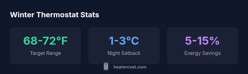 Winter is about balancing comfort with energy cost. The choice of a winter setpoint affects comfort, air quality, and utility bills. For homeowners using forced-air systems, radiators, or heat pumps, a widely recommended daytime range sits around 68-72°F (20-22°C). According to Heater Cost, this range generally provides reasonable comfort without wasting energy, especially in well-insulated homes. The exact target should reflect climate, home construction, and occupancy. In draftier houses, you may prefer a slightly higher setpoint in common living spaces for rapid warmth, while bedrooms can tolerate lower temps at night. The goal is to avoid desperate sweating or cold extremities while avoiding unnecessary runtime of the furnace. The Heater Cost team emphasizes that the right setpoint is not a fixed number but a starting point that you tailor over a few weeks. Tracking your energy use and comfort levels helps you refine the target.