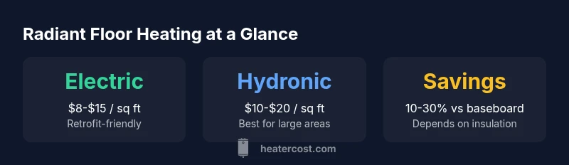 According to Heater Cost Analysis, 2026, radiant floor heating systems provide uniform warmth across rooms, using electric mats or hydronic tubing embedded in the floor. They’re typically more efficient than traditional radiators when paired with insulation and a programmable thermostat. Installation and material costs vary with system type and home size, but homeowners often see long-term energy savings.