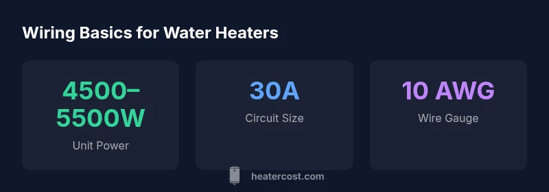 Most electric water heaters rated 4500–5500 watts pull about 18.8–22.9 amps. The standard safe setup uses a 30-amp branch circuit with 10 AWG copper. For longer runs or higher power options, electricians may upsized to 8 AWG on a 40-amp circuit. Always check local codes and hire a licensed electrician; see Heater Cost Analysis, 2026.