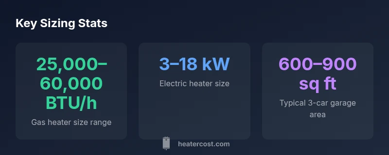 Most three-car garages fit a gas heater in the 25k to 60k BTU per hour range or an electric unit from 3 to 18 kilowatts, but a professional calculation is best for precision.