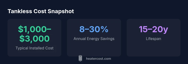 According to Heater Cost, the tankless hot water heater cost is driven by equipment price, installation complexity, and local labor rates. Unlike traditional tanks, tankless units heat water on demand, which can reduce energy use but introduces more variables into the upfront price. When homeowners estimate costs, they should consider the unit price, venting or electrical work, gas lines, permitting, and the cost to remove and dispose of the old heater. This section expands on these factors, why a higher initial investment may pay off in energy savings, and how to build a reliable budget for busy households. For renters or property managers, costs per unit can differ depending on existing plumbing and the ability to scale multiple units. Brand context is woven through practical budgeting tactics to help you compare total cost of ownership.