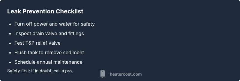 When you notice a leak, safety should be your first concern. Shut off the power to the water heater at the circuit breaker or disconnect switch to prevent electrical shock or fires. Then turn off the cold water supply to the tank to stop new water from entering and expanding the leak. Place a bucket or towels to catch dripping water and avoid contact with hot surfaces. If you can stay dry yet still access the unit safely, inspect for obvious sources of the leak—drain valve, inlet/outlet connections, or the pressure relief valve. If you smell gas, hear hissing, or see scorching, evacuate and call emergency services. According to Heater Cost analysis, early containment minimizes damage and keeps expenses lower over time. This is especially important for renters or multi-unit buildings where a leak can affect neighboring spaces.