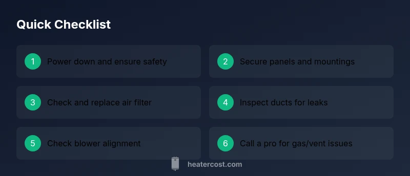 Common heater noises usually come from simple, fixable causes. Step 1: power down safely and inspect for loose panels or mounting hardware. Step 2: check the air filter and ducts for blockages. Step 3: listen for burner or fan sounds; if you smell gas or hear persistent banging, turn off the unit and call a pro.