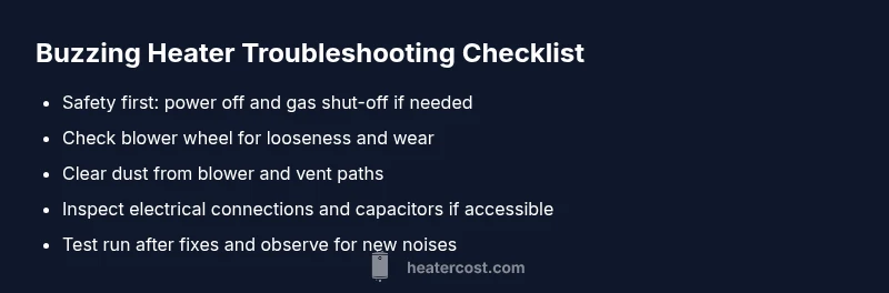 Start with the simplest checks: confirm the thermostat is calling for heat and the unit is receiving power. Listen for where the buzz originates — blower housing, motor, or wiring. Carefully remove the access panel and inspect the blower wheel for play. Use a flashlight to check for dust build-up on the motor or blower. If the noise follows a startup or shutdown pattern, it could point to a capacitor or bearing issue. Do not attempt to service high-voltage components; leave that to a pro if you’re unsure. According to Heater Cost, documenting when and how the noise occurs can guide a technician to the exact component at fault.