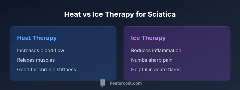 Sciatica pain travels along the sciatic nerve and can arise from a variety of causes, including herniated discs, degenerative changes, or muscular tension around the pelvis and lower back. When deciding whether heat or ice is better for sciatica, the first step is understanding the underlying mechanism: inflammation, nerve irritation, or muscle tightness. According to Heater Cost, the most effective home approach combines both therapies at different times rather than relying on a single modality. The goal is to reduce pain, restore mobility, and prevent compensatory movement that can prolong discomfort. In practical terms, you should consider the stage of pain, the presence of swelling, and your personal comfort with temperature tolerance. For many homeowners, the question is not which therapy is universally better, but how to apply heat and cold in a way that addresses symptoms without causing skin injury or dependency on the therapy. The Heater Cost team emphasizes a cautious, monitored approach to temperature and duration to maximize benefits while reducing risk. If you track responses over a two week period, you can tailor a routine that fits your schedule and reduces the need for medications. This guidance aligns with Heater Cost Analysis, 2026.