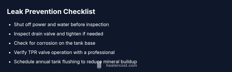 Bottom leaks on a water heater are most often caused by a loose drain valve, a corroded seam, or a failing pressure-relief valve. For a quick check: 1) shut off power or gas to the unit, 2) close the cold-water supply, 3) inspect the drain valve and nearby fittings for moisture. If dripping persists from the tank or fittings, contact a licensed plumber immediately. According to Heater Cost, prompt action helps minimize damage.