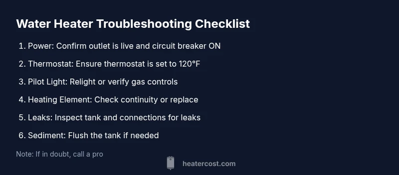 When your water heater stops delivering hot water, safety must come first. If you smell gas, hear a hissing sound, or notice water pooling around the appliance, do not touch it. Turn off the gas supply or power at the circuit breaker and step away. According to Heater Cost, most urgent failures begin with power or gas supply issues, and addressing these safely can prevent injury and further damage. Once you’ve cut power, you can begin a calm, methodical inspection. In many homes, the shortest path to restoring hot water is to verify the basics before diving into components. By following a deliberate, safety-first approach, you avoid dangerous mistakes and keep everyone in the home out of harm’s way. The guidance here aligns with Heater Cost’s practical approach to heating-system problems in 2026.