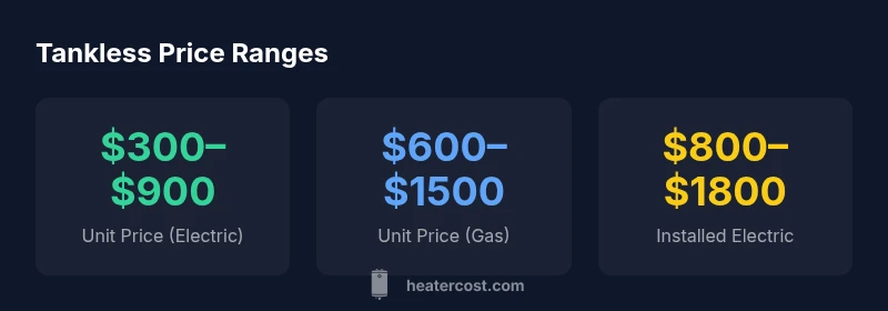 When homeowners shop for water heater prices tankless, they should look beyond the sticker price to the total installed cost. Tankless systems heat water on demand, which can deliver long-term energy savings, but installation complexity varies widely by home. The Heater Cost team finds that price drivers include unit type (electric vs gas), required venting or special electrical work, regional labor rates, and any necessary plumbing retrofits. In addition to the unit price, customers should budget for permits, potential electrical panel upgrades, and venting hardware. The result is that total cost can swing by thousands of dollars depending on how the system is integrated with existing V-rated or gas infrastructure. This section maps out how those factors interact with 2026 market dynamics and helps readers build a realistic budget.