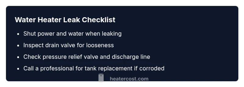 Most water heater tank leaks originate from corrosion, a loose drain valve, or a faulty pressure-relief system. Quick fix: 1) shut off power and the cold-water supply, 2) place a bucket and drain a small amount to inspect the drain valve, 3) if the leak persists, shut off the water heater and call a licensed plumber.