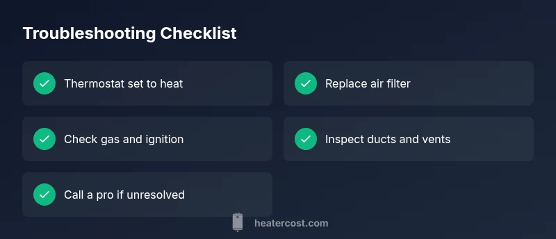 This section covers safe, no-special-tools checks you can do to isolate the problem. Start with the thermostat: ensure it is set to heat, and that the setpoint is higher than the current room temperature. If you have a programmable or smart thermostat, verify it has not drifted to a cooling schedule or an off state. Next, inspect the air filter. A clogged filter reduces airflow and can make the furnace seem like it's blowing cold air even when the burners are working. Replace it if dirty and run the system again. Check the air vents and duct dampers to ensure they are open and not blocked by furniture or debris. If you have a gas furnace, listen for a gas valve hum and a brief igniter click when heat is called. If you smell gas or hear loud banging noises, shut off power and gas supply and contact a professional immediately. Finally, confirm the furnace’s switch and circuit breaker are in the ON position.
