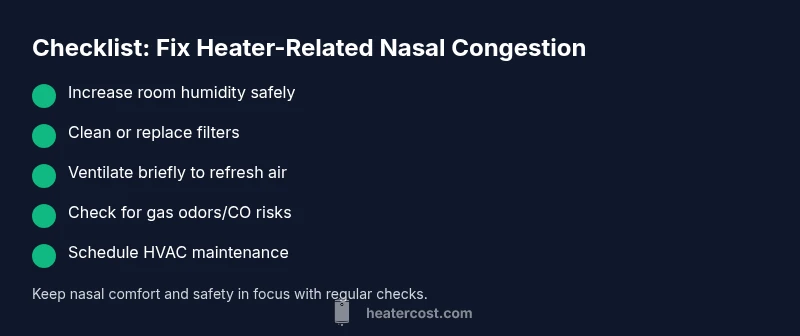 Nasal congestion when heaters run is usually caused by dry air, dust, and minor contaminants in the airflow. Start by humidifying the room, cleaning or replacing filters, and improving ventilation. If symptoms persist or you notice a gas odor or dizziness, stop using the heater and seek professional help. It can often be resolved by improving humidity and filtration.