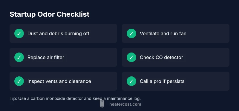 From the Heater Cost perspective, startup odors should be treated as a maintenance warning rather than a normal occurrence. Our analysis shows that most startup smells are benign dust or coating-related issues when detected early and addressed with ventilation and a filter change. The Heater Cost team recommends scheduling annual professional checkups and keeping safety gear like CO detectors up to date. This proactive approach reduces risk and extends system life while keeping your home safer.