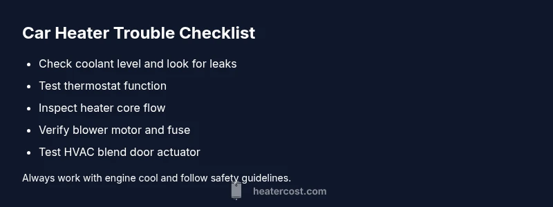 According to Heater Cost, no-heat conditions in a car's cabin most often trace to coolant or HVAC issues. The leading culprits are low coolant, a thermostat stuck closed, or a heater core clogged with mineral deposits. Leaks, worn hoses, or a failed radiator cap can drain coolant and undermine cabin warmth. A malfunctioning blend door actuator or a weak blower motor can also prevent warm air from reaching the cabin. Finally, air pockets after refilling coolant can briefly disrupt heat until the system self-purges. Understanding these possibilities helps you triage quickly and avoid unnecessary repairs.