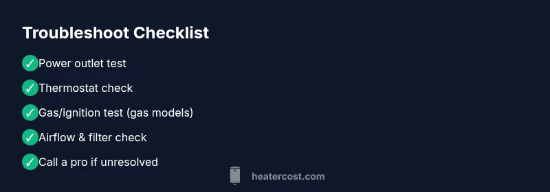 If you're asking why is my heater not turning on, you're not alone. A not-starting heater can be caused by power issues, thermostat misreads, safety switches, or fuel supply problems. According to Heater Cost, homeowners who quickly confirm basic power and settings can avoid a costly service call and often fix simple faults in minutes. In this guide, we’ll walk through a practical, safe troubleshoot path that you can perform yourself before reaching for tools or a professional. The aim is to restore heat quickly and safely while protecting your equipment. Throughout this article we’ll reference common failure points, provide a clear diagnostic flow, and include a plan you can follow step by step. If you’re new to home maintenance, don’t worry — we’ll keep explanations plain and actionable. Remember: any work involving gas, electricity, or the risk of fire should be approached with caution and, when in doubt, call a professional. This is especially important if your model has a history of flashing codes or you smell gas in the area.