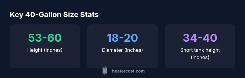 How big is a 40 gallon water heater? Most residential tanks are vertical cylinders about 53–60 inches tall and 18–20 inches in diameter. Short models exist at roughly 34–40 inches tall with the same diameter. Actual dimensions vary by manufacturer, venting, and whether the unit is tall or short, so check the label for exact measurements.