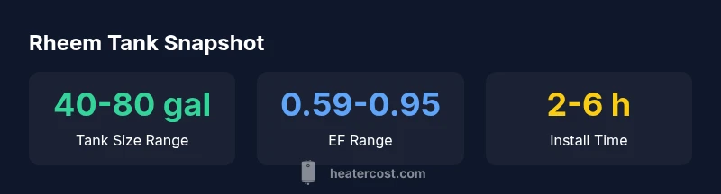 Energy efficiency in Rheem tanks is measured by the energy factor (EF). Higher EF means more hot water per unit of energy, but the upfront cost may be higher. Newer Rheem models typically range EF from about 0.59 to 0.95, depending on fuel type and recovery rate. When comparing models, look beyond the EF number; consider standby heat loss, insulation thickness, and the quality of anode rods. In addition to EF, you’ll want to consider the overall system efficiency: a well insulated tank reduces standby losses even if EF is similar across models. For households in colder climates, the difference between a 0.60 EF and a 0.90 EF can translate into notable annual energy savings, especially if you run high demand daily. The Heater Cost team highlights that efficiency and sizing work together to minimize cost per gallon of hot water over the tank’s life.
